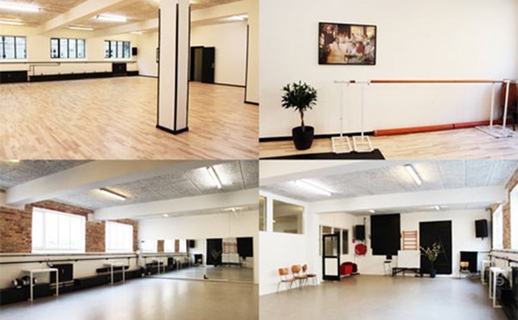 De to øverste fotos er fra den store sal, som er 160 m2, og nu har dansevinyl på gulvet.